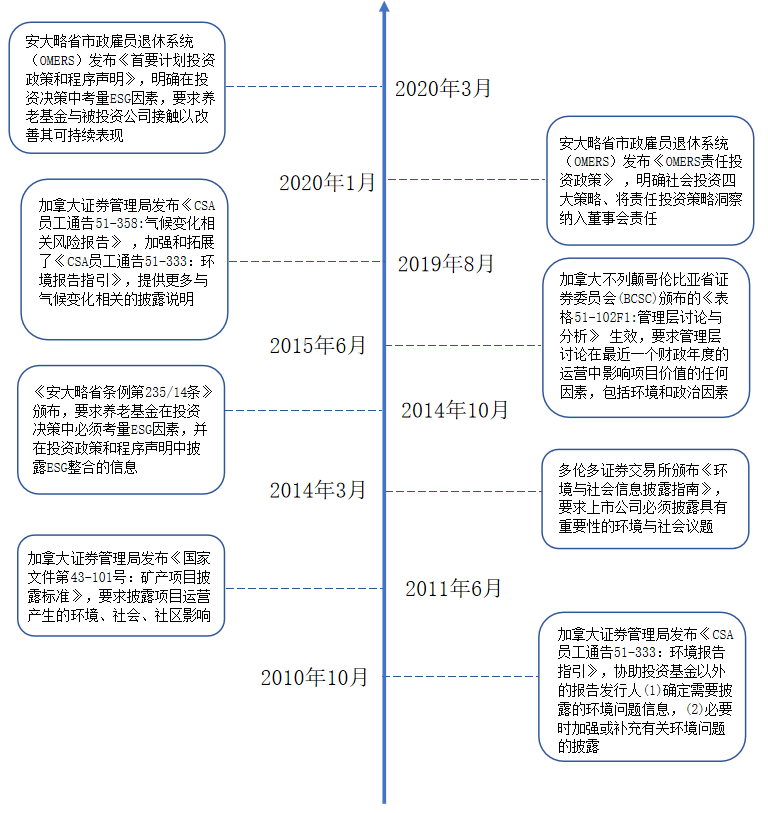近十年來,加拿大不斷研究出臺新政策和法規(guī),完善原有法律法規(guī),逐步規(guī)范和細化市場各參與方對ESG要素的考量及信息披露的要求,為ESG投資的發(fā)展奠定制度基礎(chǔ)。